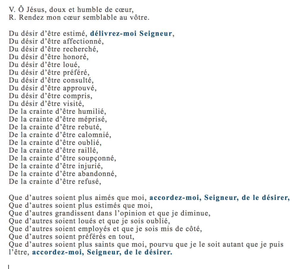 Quels remèdes préventifs pouvons-nous adopter ? Réciter les Litanies de l’Humilité ou d’autres prières qui nous aident à résister aux tentations quotidiennes de vanité et d’orgueil (à retrouver à la fin de cet article). Cela pourrait être une bonne résolution de carême. Faire fleurir nos vertus, qui nous rendent véritablement belles, et travailler sur les défauts qui causent du tort à notre entourage et à nous-mêmes. Il n’y a aucune chirurgie esthétique pour notre âme, qui ne soit pas l’effort quotidien et la prière. Accepter ses défauts et ne pas se prendre trop au sérieux. Même la plus performante des interventions chirurgicales ne pourrait effacer l’entièreté de nos défauts et il y en aura toujours un qui finira par nous complexer. Accepter ses défauts est surement une alternative moins couteuse, moins dangereuse, et plus efficace. Savoir en rire nous aidera aussi à relativiser leur importance. Écouter notre mari ou nos enfants lorsqu’ils nous disent que nous sommes belles. Comme le dit Bourvil dans le film «  Mais il y a beauté et beauté. Il y a celle qui saute aux yeux, qui nous aveugle. Et il y a celle qu’on découvre peu à peu, car elle vient du dedans, de l’intérieur, comme on dit ». Notre famille voit surtout notre beauté intérieure, qui se manifeste dans notre courage quotidien, dans la patience dans les épreuves et les actes de charité que nous accomplissons au quotidien. Ils ne nous regardent pas avec les yeux du monde, dont les critères de beauté nous poussent à la vanité.